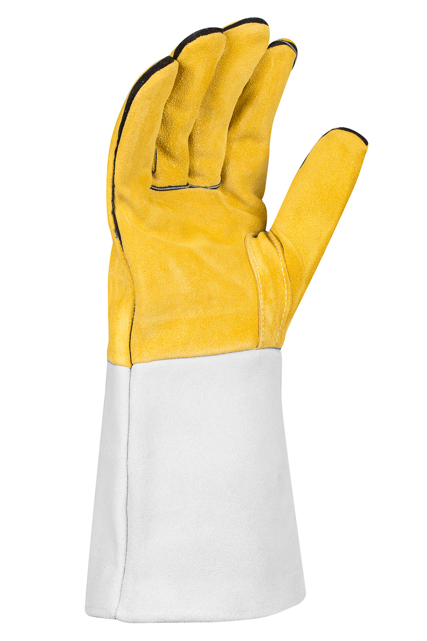 Welding gloves made of top quality split cowhide, finished inside with a lining. Exceptionally resistant, sewn with a strong and temperature-resistant thread, with additional reinforcement at the thumb base and with covers protecting stitches against burning. Top quality materials ensure perfect fit and comfort. A long stiffened cuff protects the forearm.