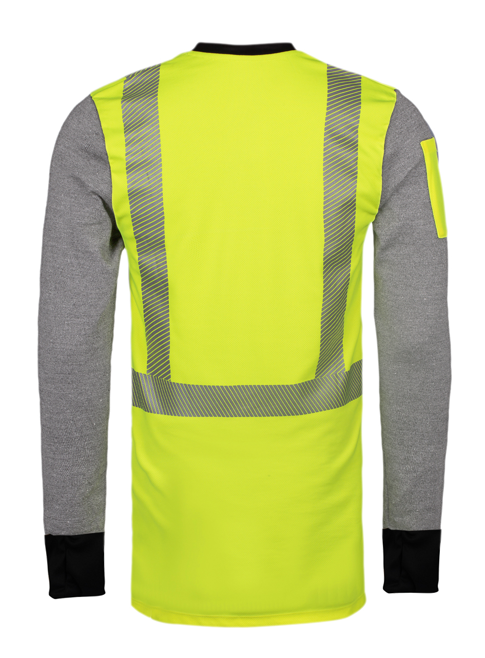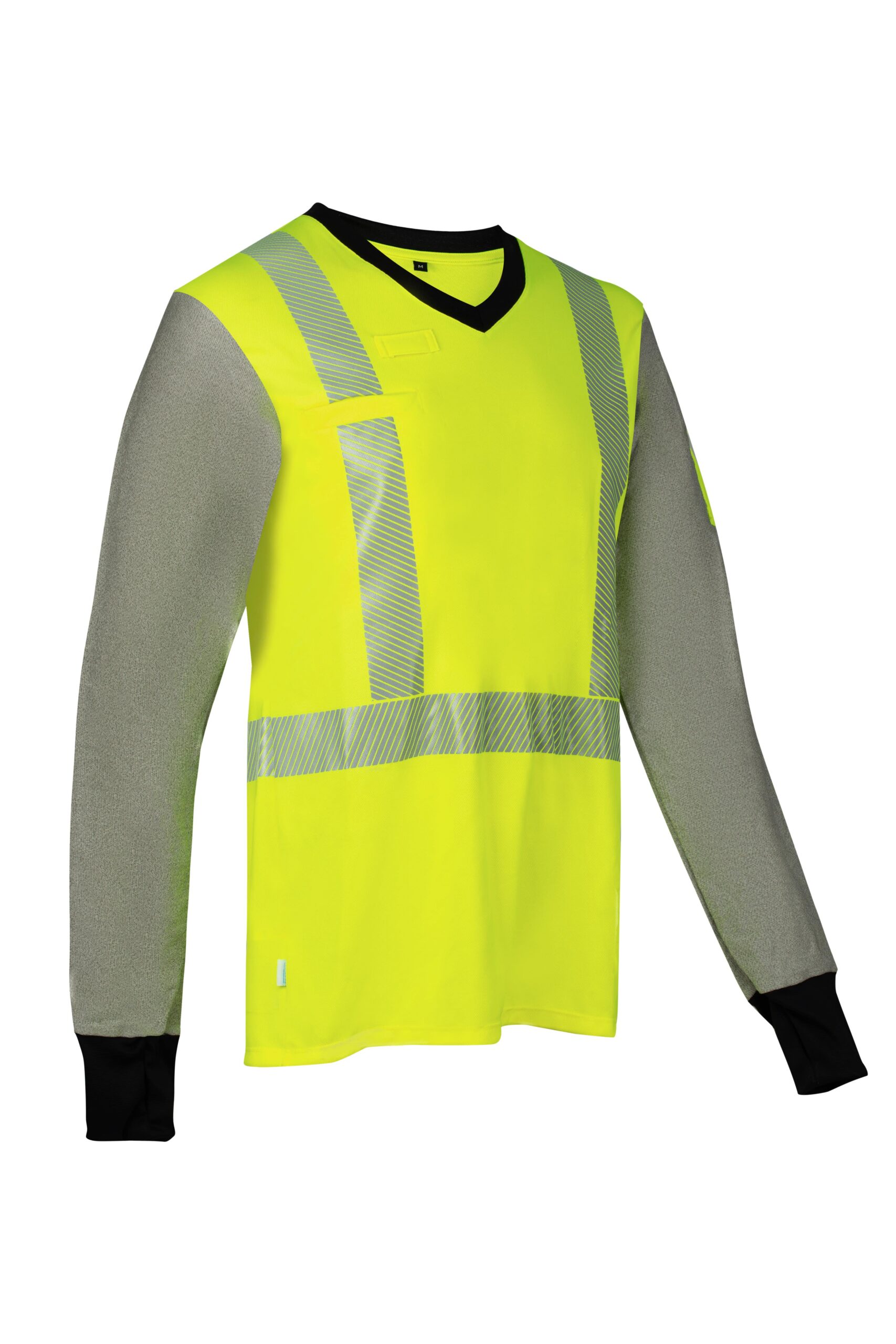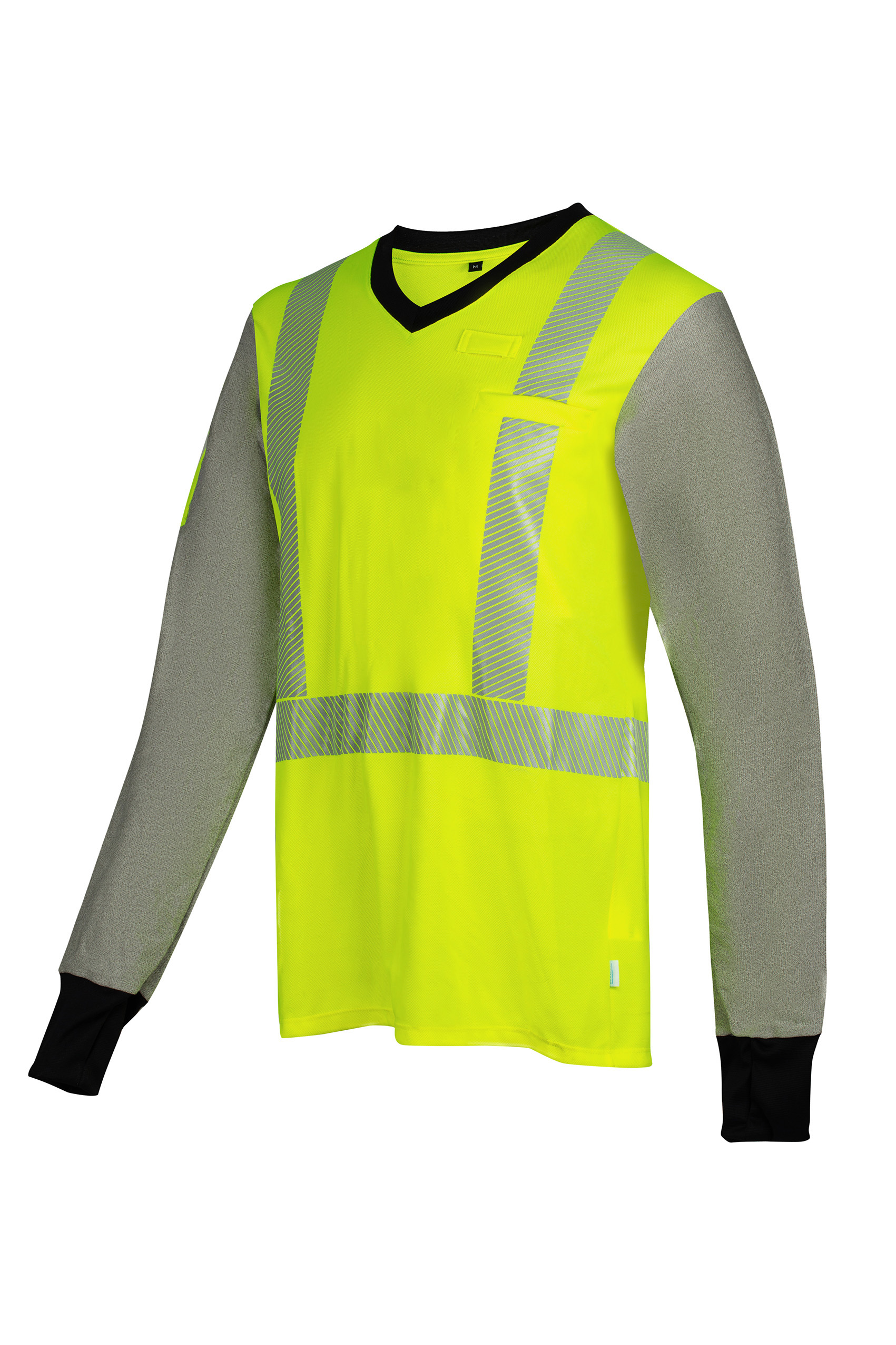 Bluza z rękawami wykonanymi z materiału o bardzo wysokiej odporności na przecięcie – poziom E wg ISO 13997 TDM. Materiał ten, dzięki włóknom Dyneema®, znacząco zwiększającym właściwości antyprzecięciowe, zapewnia również zdecydowanie dłuższy czas użytkowania. Miękki, elastyczny i przyjemny w dotyku w porównaniu do innych dostępnych na rynku materiałów oferujących ochronę przed przecięciem, gwarantuje użytkownikowi najwyższy komfort. Przód i tył bluzy z wykonane z tkaniny COOLMAX® EcoMadeFresh, pochodzącej w 100% z recyklingu butelek z tworzywa sztucznego.  Wbudowane we włókna Coolmax jony srebra redukują aktywność bakterii o 99%, dzięki czemu użytkownik unika przyjemnego zapachu odzieży nawet po długim dniu pracy. Model z dodatkowymi elementami HI-VIS dla lepszej widoczności.