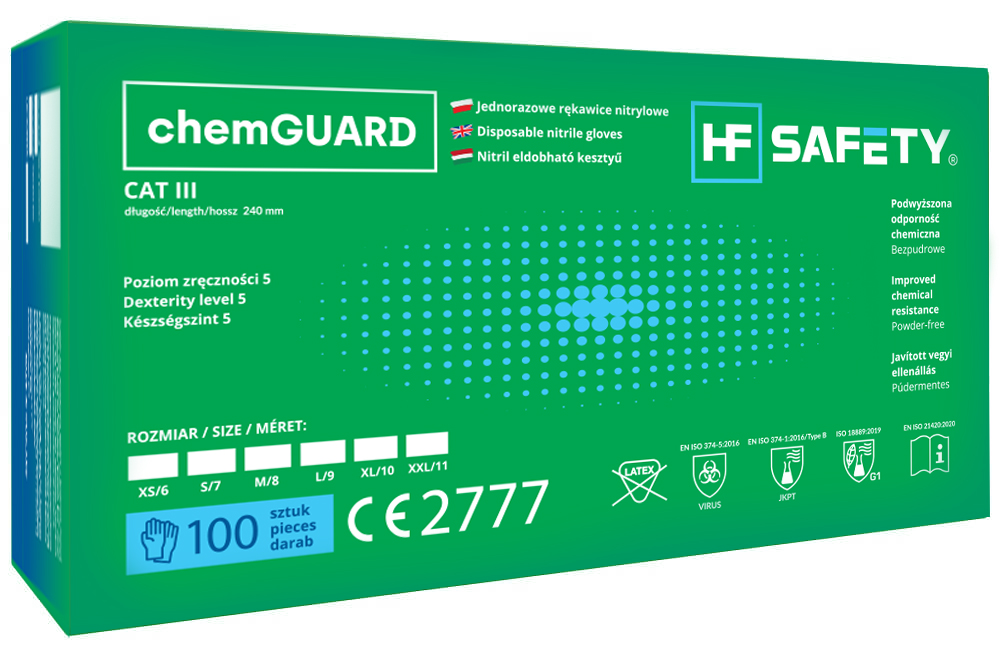 Rękawice jednorazowe chemGUARD certyfikowane są jako profesjonalna ochrona chemiczna (typ B), zapewniająca czas przenikania przez co najmniej 30 minut dla przynajmniej 3 substancji z listy 18 przebadanych chemikaliów, według normy EN ISO 374-1:2016+A1:2018/TYPE B. Rękawice nitrylowe chemGUARD posiadają również certyfikat CE i klasyfikowane są jako środki chroniące przed zagrożeniami mogącymi powodować bardzo poważne konsekwencje (rozporządzenie UE 2016/425) – CAT III. Model rękawic chemGUARD zapewnia również skuteczną barierę przed mikroorganizmami, takimi jak bakterie, grzyby oraz wirusy według normy EN ISO 374-5:2016.