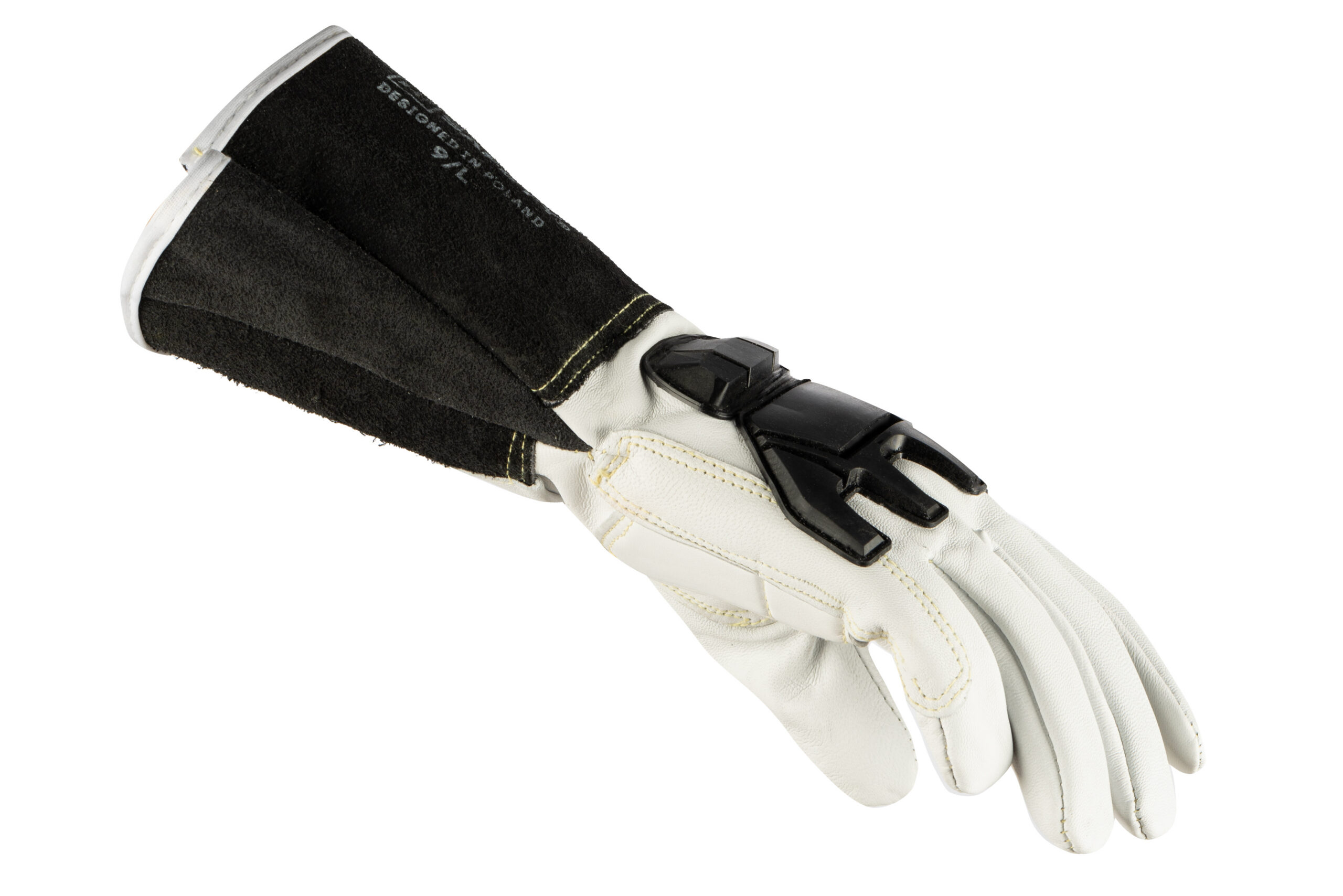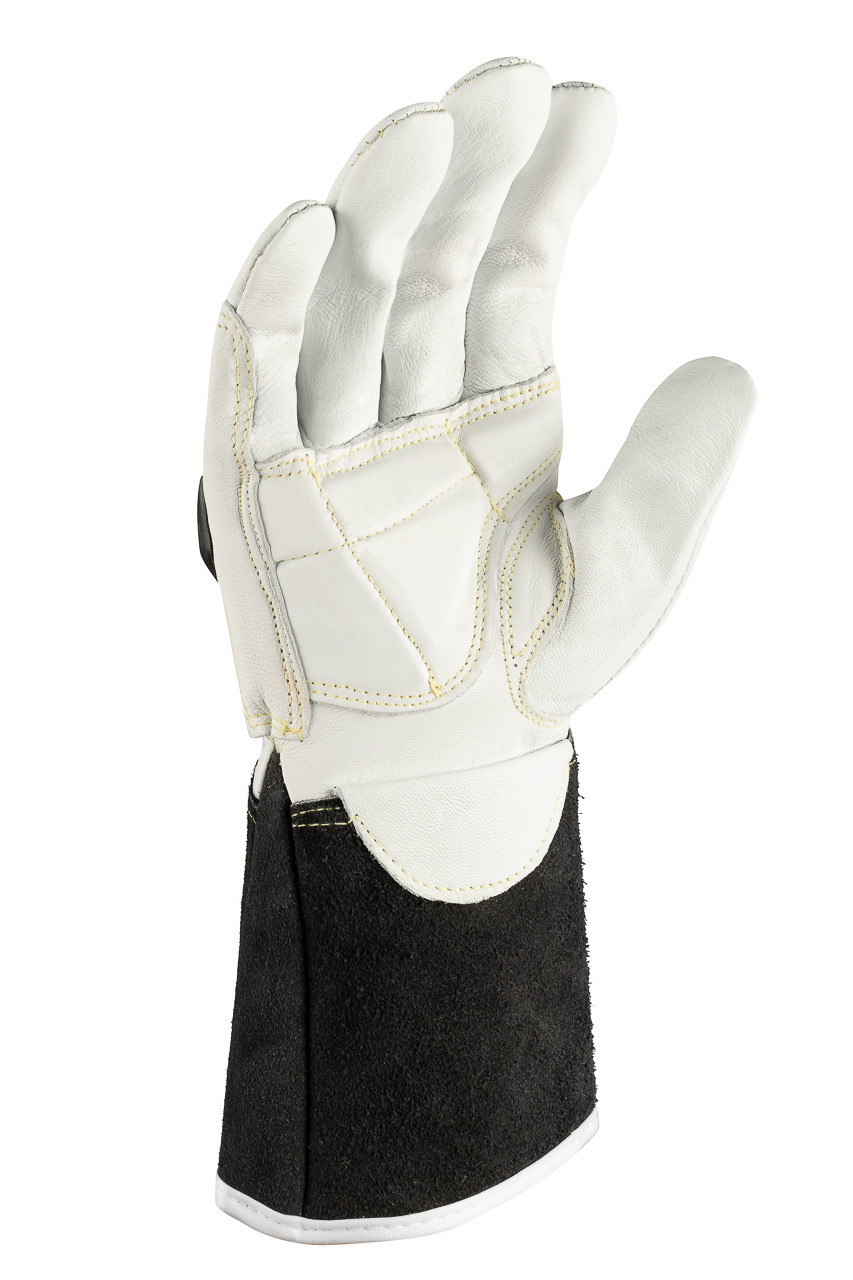 Rękawice ze skóry licowej. Dzięki TPR na grzbiecie dłoni oferują ochronę przed uderzeniem, a wzmocnienia w postaci poduszek w części chwytnej zapewniają ochronę przed zagrożeniami mechanicznymi. Dodatkowe skórzane naszycia oraz przeszycia między kciukiem a palcem wskazującym podnoszą wytrzymałość rękawic, a mankiet z dwoiny, zabezpiecza nadgarstek i część przedramienia.  Model dobrze dopasowany do dłoni, zapewnia użytkownikowi dobry chwyt, wygodę i komfort podczas pracy.