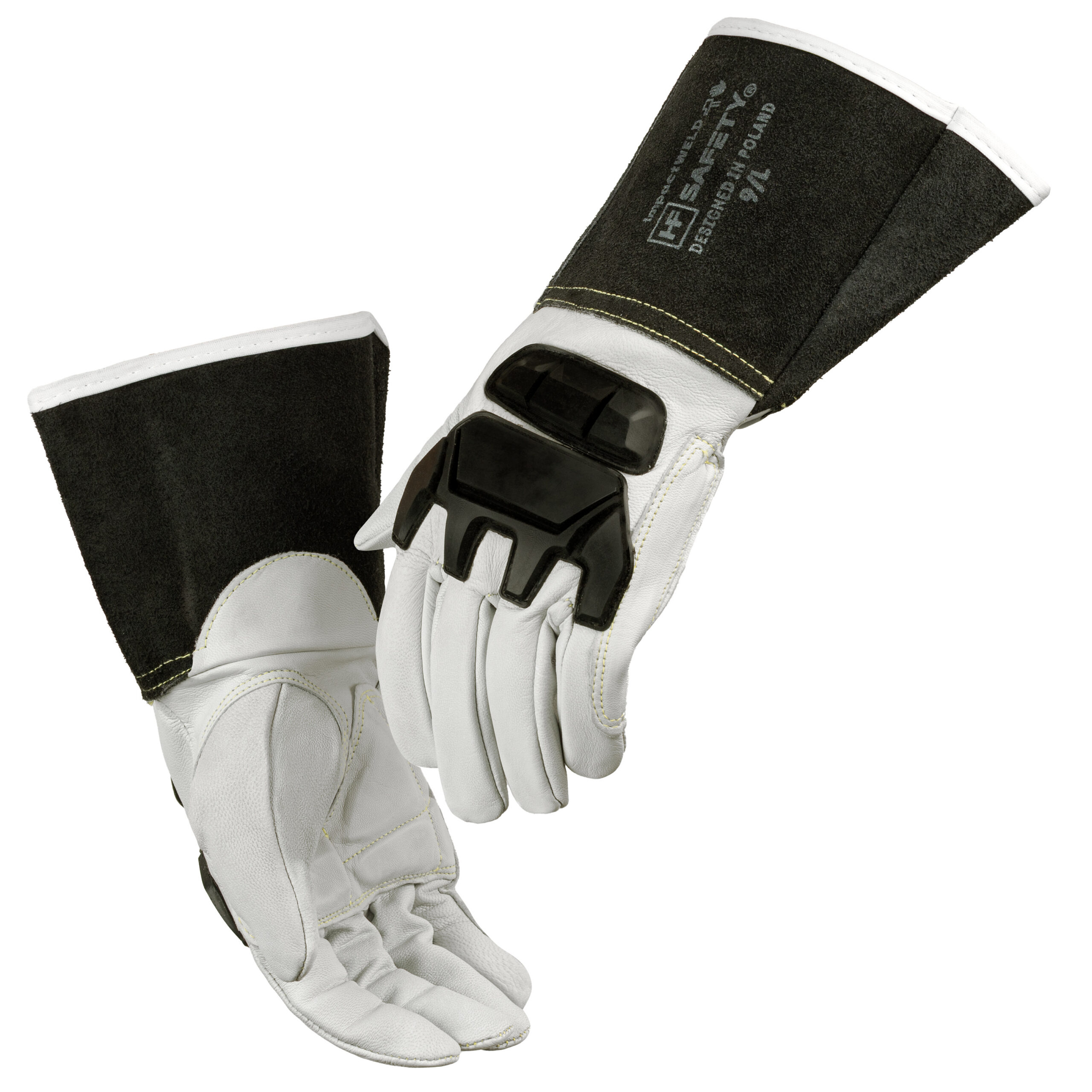 Rękawice impactWELD marki HF SAFETY, chroniące przed uderzeniami. Dzięki TPR na grzbiecie dłoni oferują ochronę przed uderzeniem, a wzmocnienia w postaci poduszek w części chwytnej zapewniają ochronę przed zagrożeniami mechanicznymi.